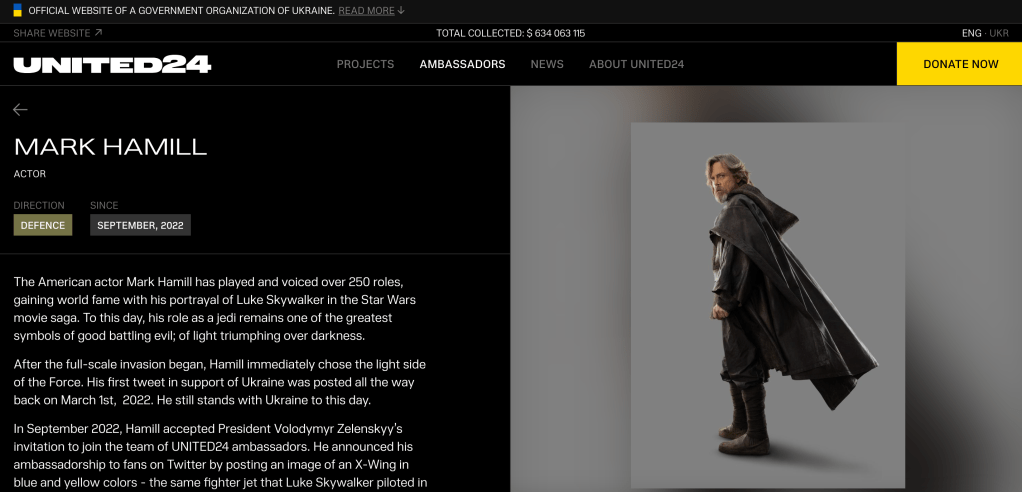 UNITED24 describes itself as “the official fundraising platform of Ukraine.” And then further elaborates that its technical purpose is to host a “platform [that] allows one-click donations to Ukraine from anywhere.” Before informing the reader that its strategic purpose is “to establish an efficient work process that brings Ukraine’s victory closer.” Its slick website contains a page dedicated to project Ambassadors, which includes still photographs of celebrity promoters. The UNITED24 campaign is apparently a recruitment programme designed to onboard eminent personalities that are willing to promote its aims and objectives. Once onboarded, these celebrities identify an area of designated interest from a predetermined list of five. The five areas for investment are identified on the UNITED24 website as Defence, Humanitarian Demining, Medical Aid, Rebuild Ukraine, and Education and Science. Each celebrity then shills for additional donations, whilst making a brief statement relevant to their own actions, and in relation to the chosen area of investment.