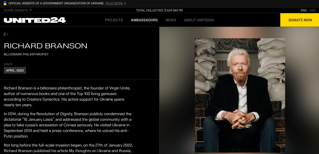 The recruitment programme has been an ongoing concern since 2022. Key personalities lending public support to UNITED24 and its campaign, include actors Mark Hamill, Bear Grylls, Barbara Streisand, Liev Schreiber, and Mark Strong. A significant personality also listed here is Richard Branson who is described here as a “billionaire philanthropist.” The website states that billionaire philanthropist Branson “visited Ukraine in September 2014 and held a press conference, where he voiced his anti-Putin position.” Branson then visited Ukraine again “in the summer of 2022 visiting the destroyed airport in Hostomel.” During Branson’s “next visit in 2023 he met with President Volodymyr Zelensky and joined the fundraising platform UNITED24 as an ambassador.” Branson’s reaction to the role of ambassador for UNITED24, is described on the website in this manner: “Faced with this horrific war, Ukraine has become a beacon of determination and hope for the world. It is a great honor for me to become an Ambassador for UNITED24. I look forward to using Virgin Unite’s global reach and networks to help support the great work UNITED24 is doing.” In light of this, it is not difficult to discern a direct link between billionaire philanthropist Branson and the Ukrainian government that travels as far back as September 2014.