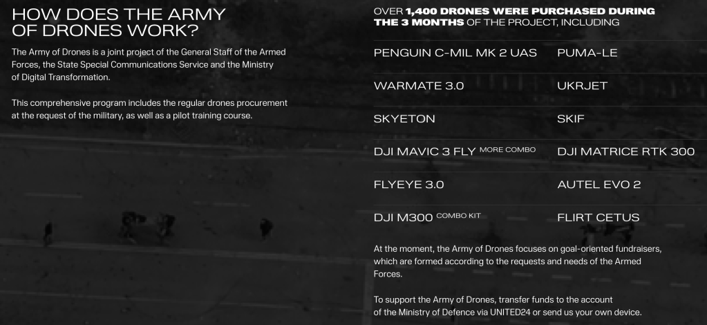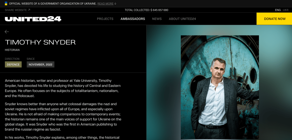 The website claims that the current total amount of donations arriving in Ukraine via the UNITED24 web portal exceeds $645 million. As mentioned, these contributions can be allocated to one of five areas. For example, actor Mark Hamill has selected the Defence investment area, and has so far donated nearly $300,000 and “continues collecting funds towards 10 Danish RQ-35 Heidrun reconnaissance drones.” Another example includes historian Timothy Snyder, a professor at Yale University. Like Hamill, Snyder has also selected the Defence investment area. Snyder states that he wants to “raise funds to help Ukraine defend itself against killer drones.” According to the website, Snyder has to date contributed $1.3 million for the procurement (and ongoing maintenance?) of the Shahed Hunter anti-drone system. No investment area or financial contribution is listed in relation to Richard Branson.