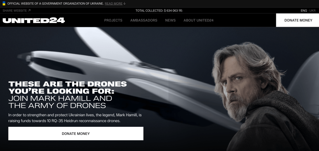 In sum, the UNITED24 operation seeks to generate capital of two varieties. Firstly, it remains evident that financial capital is being raised to support the Ukrainian military effort. Money for drones are war contributions. Secondly, the public nature of the slickly designed website, indicates that political capital is also sought. The UNITED24 website serves as promotional material for the idea of an anti-Russia situated on Russia’s doorstep. Various high profile personalities, as well as well-known companies, have openly and publicly pledged their allegiance to this impossible idea. But it apparently remains an idea that public figures like Hamill, Snyder, and Branson wish to see realised. Moreover, the website acts as recruitment portal for others who may share these delusions of victory for Ukraine. All should know, only Russia can win this war. Hence, one may wonder what $645 million has been thrown towards. One may also quite sensibly wonder where precisely this cash hoard is being stored and who has control over it.