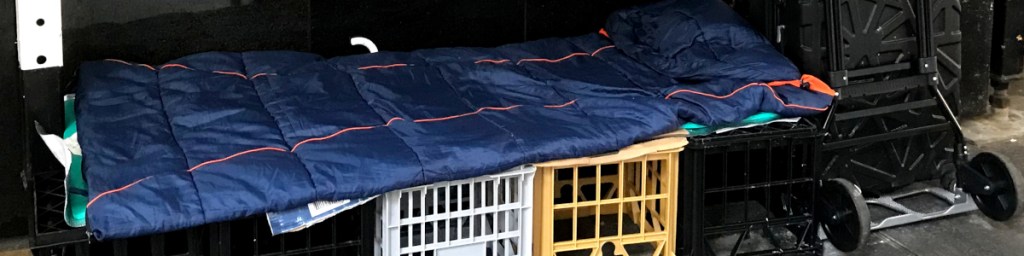 The architectural overhang of the nearby building provides those sleeping rough with immediate cover from rainfall. Most of the homeless have sleeping bags, and a few have a blanket or two. In some places, milk crates are overturned to form a “bed base,” which is then covered with cardboard. In others, the cardboard has been laid flat directly on the ground, underneath the “bed,” to keep the chill to a minimum. However, each person sleeping out of doors must surely still feel the cold air penetrate into their bones after dark.