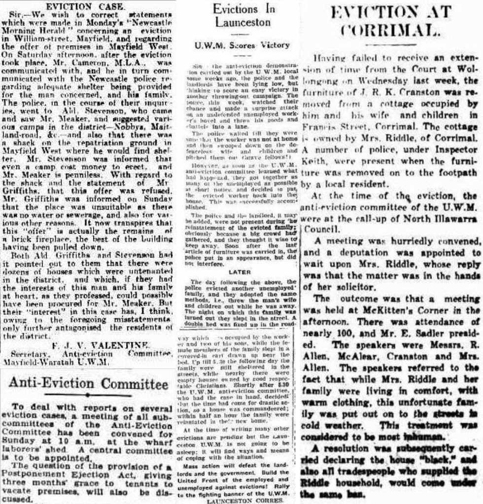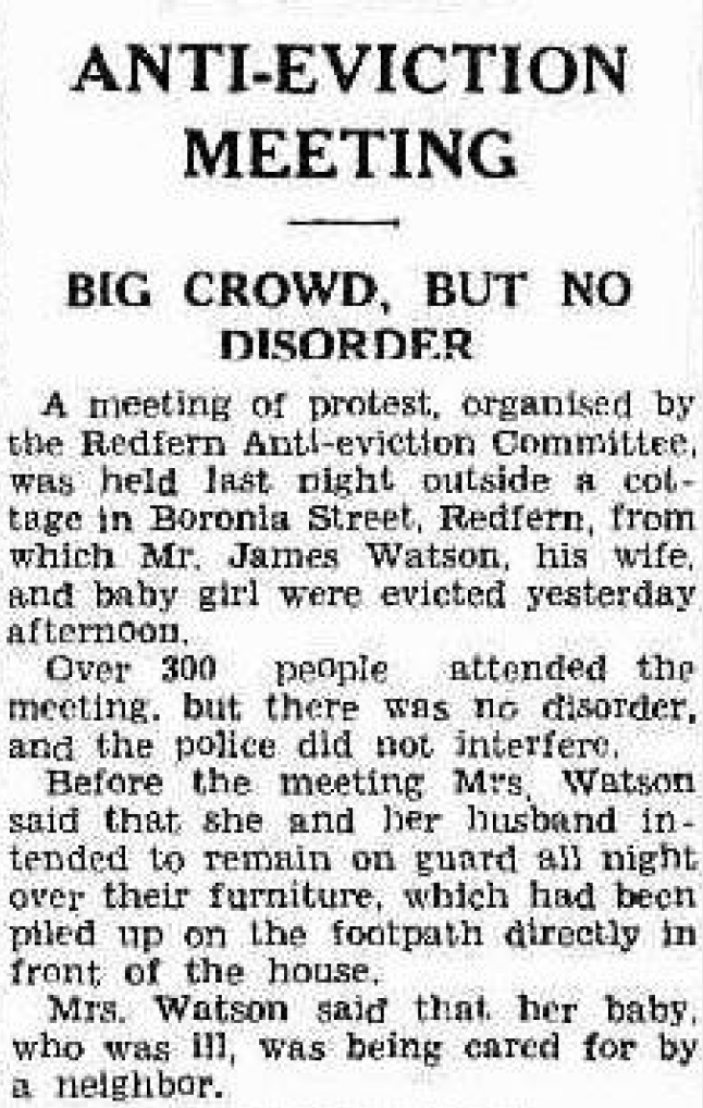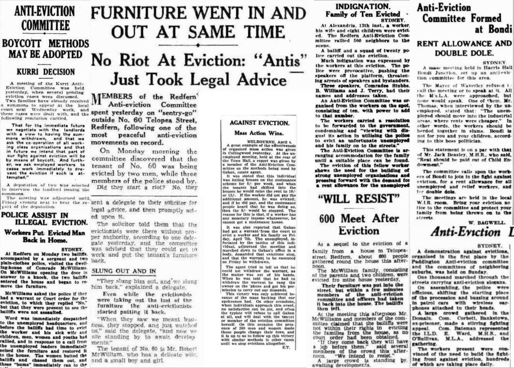 In Sydney during the 1930s, this noble work was undertaken by the Anti-Eviction Committee. Known affectionately as the “Anti’s,” the Anti-Eviction Committee organised against these shameful evictions, some of which displaced families with children from their homes and left them to sleep in the streets.